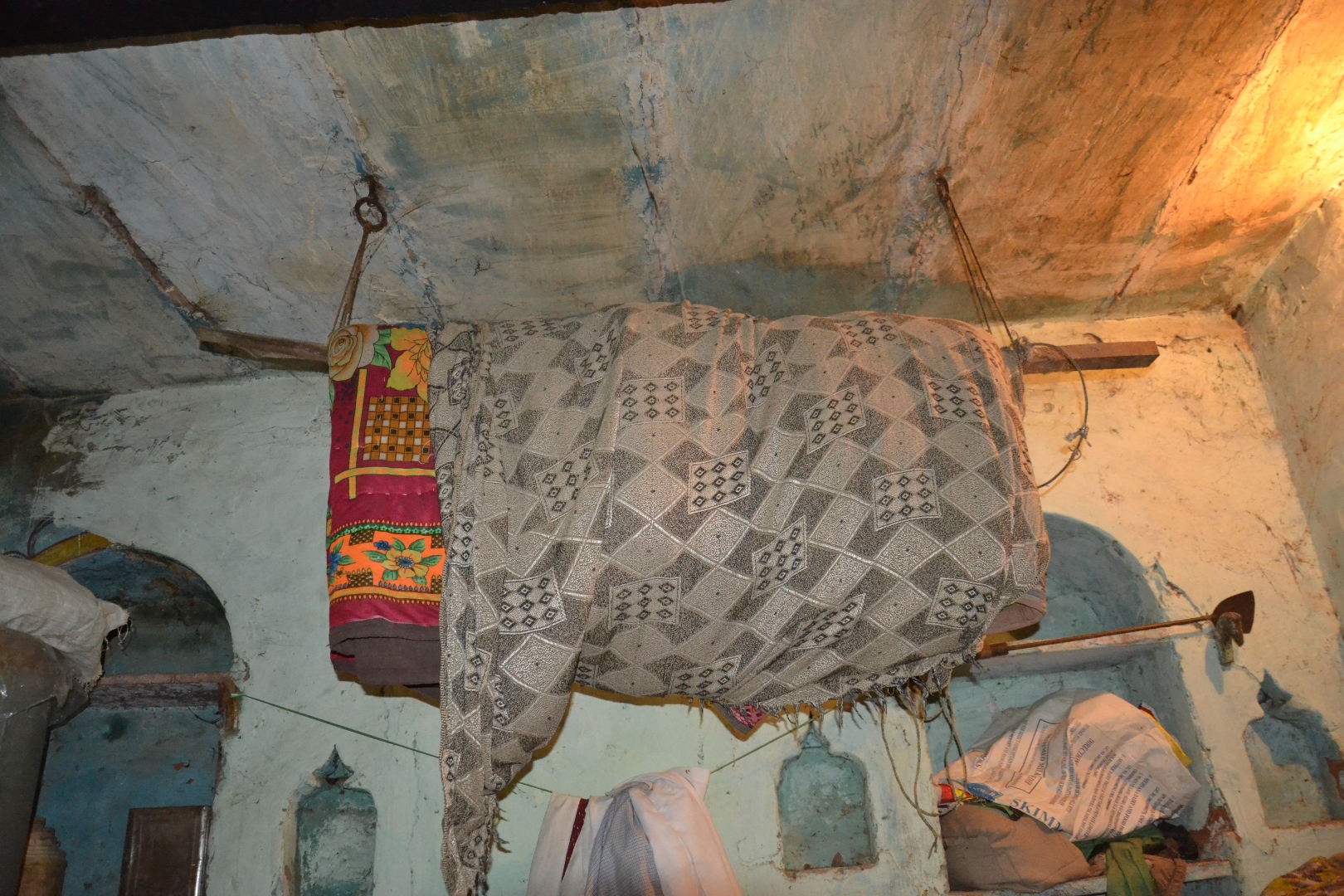 This alagni was made using a bamboo pole that was suspended from hooks fixed to the ceiling, using jute ropes. Raw cotton was wrapped in an old saree and stored on this alagni, to be later used for making mattresses.