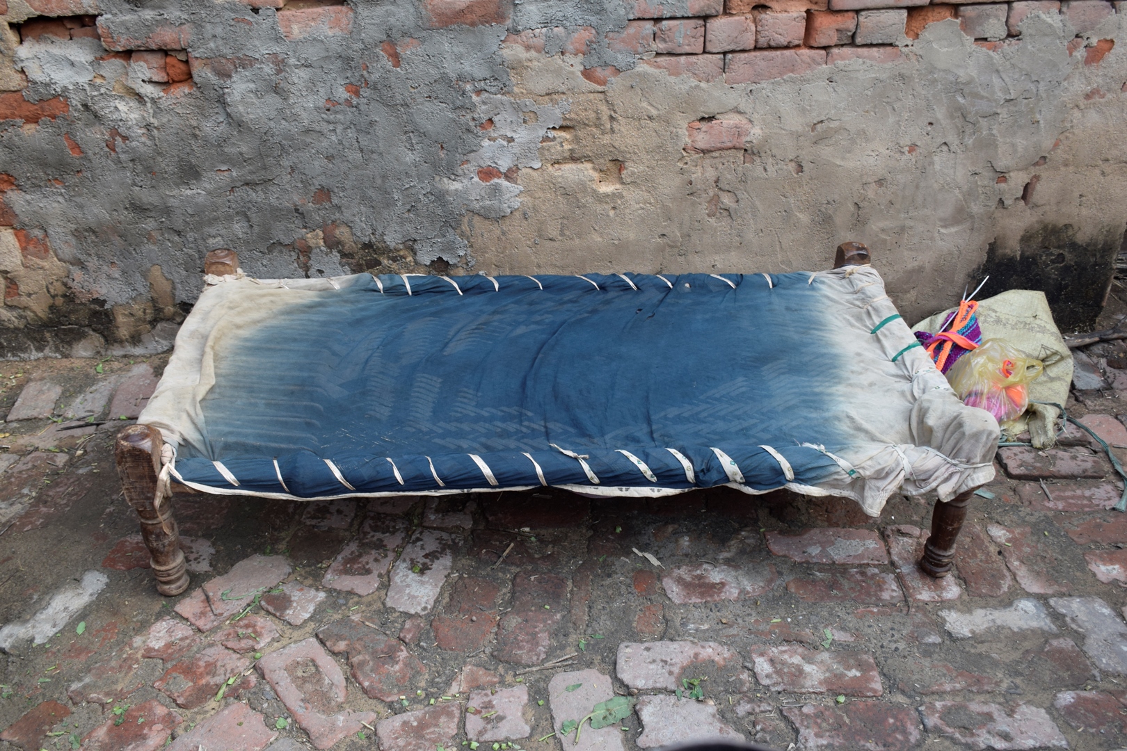 Placed in the courtyard of the house, this charpai was used by the family members to sit on during the day. The webbing was woven using cotton ropes. Since it was used outdoors, a cotton cover was stitched around the webbing to prevent it from getting dirty. The cover was removed and washed every two months.