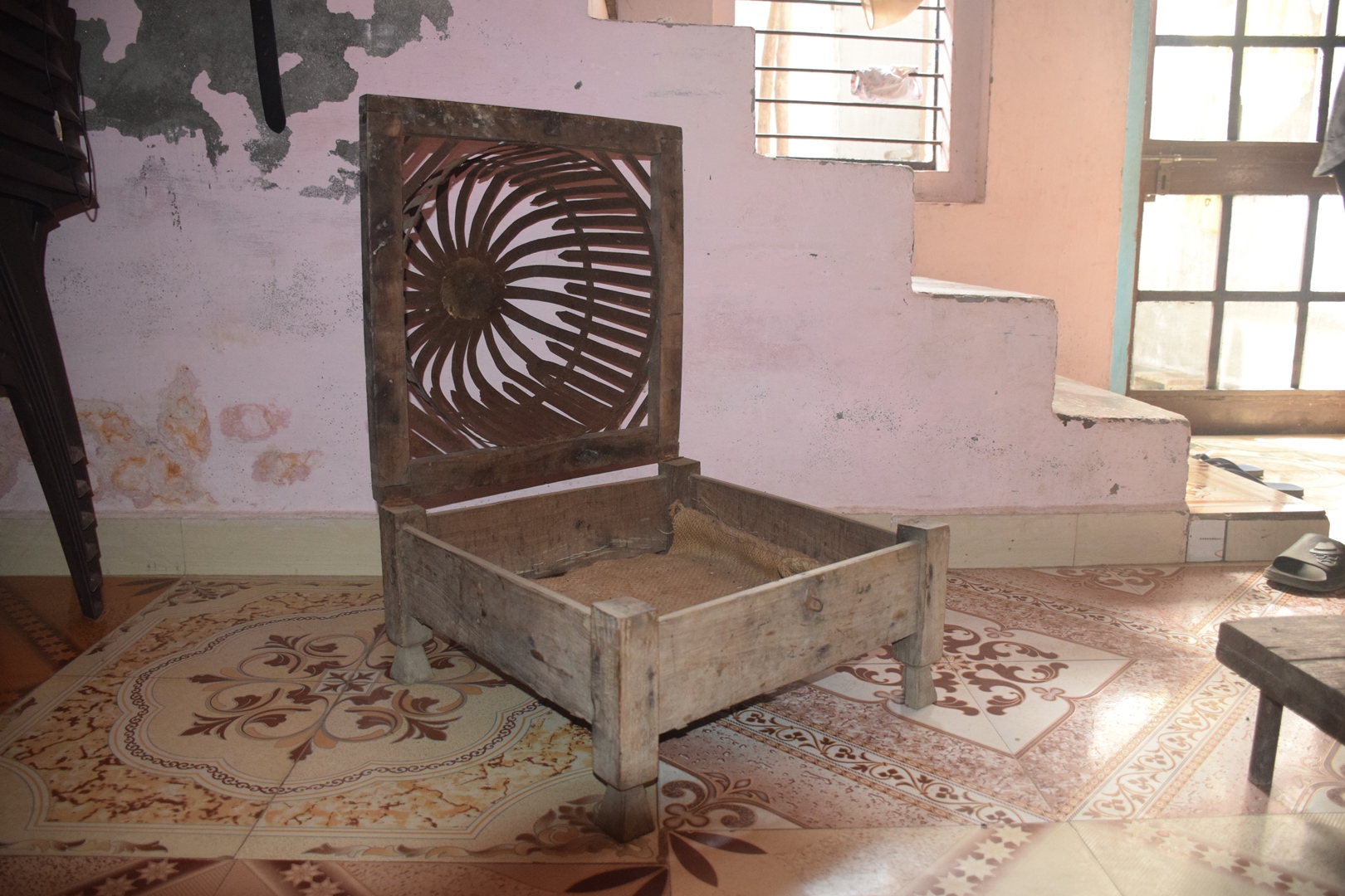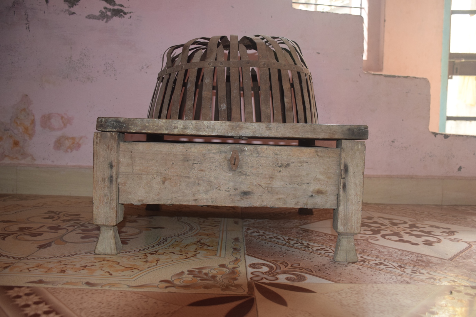 This chhikka was stored on top of a sandook and was no longer used. It was brought down to be documented. The chhikka was raised up from the floor on four simple carved legs and the entire stand was made using wooden planks.