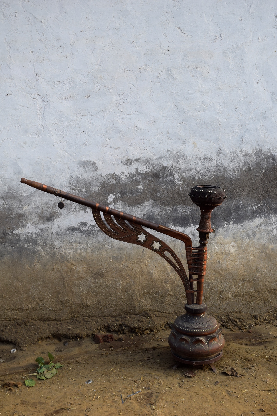 This hookah was constructed entirely out of rohida wood except the chillum which was made of terracotta. It was decorated with metal embellishments and was made by a craftsperson from Mahendragarh district. Mustard oil is applied on the entire hookah, every fortnight, to maintain the wood.