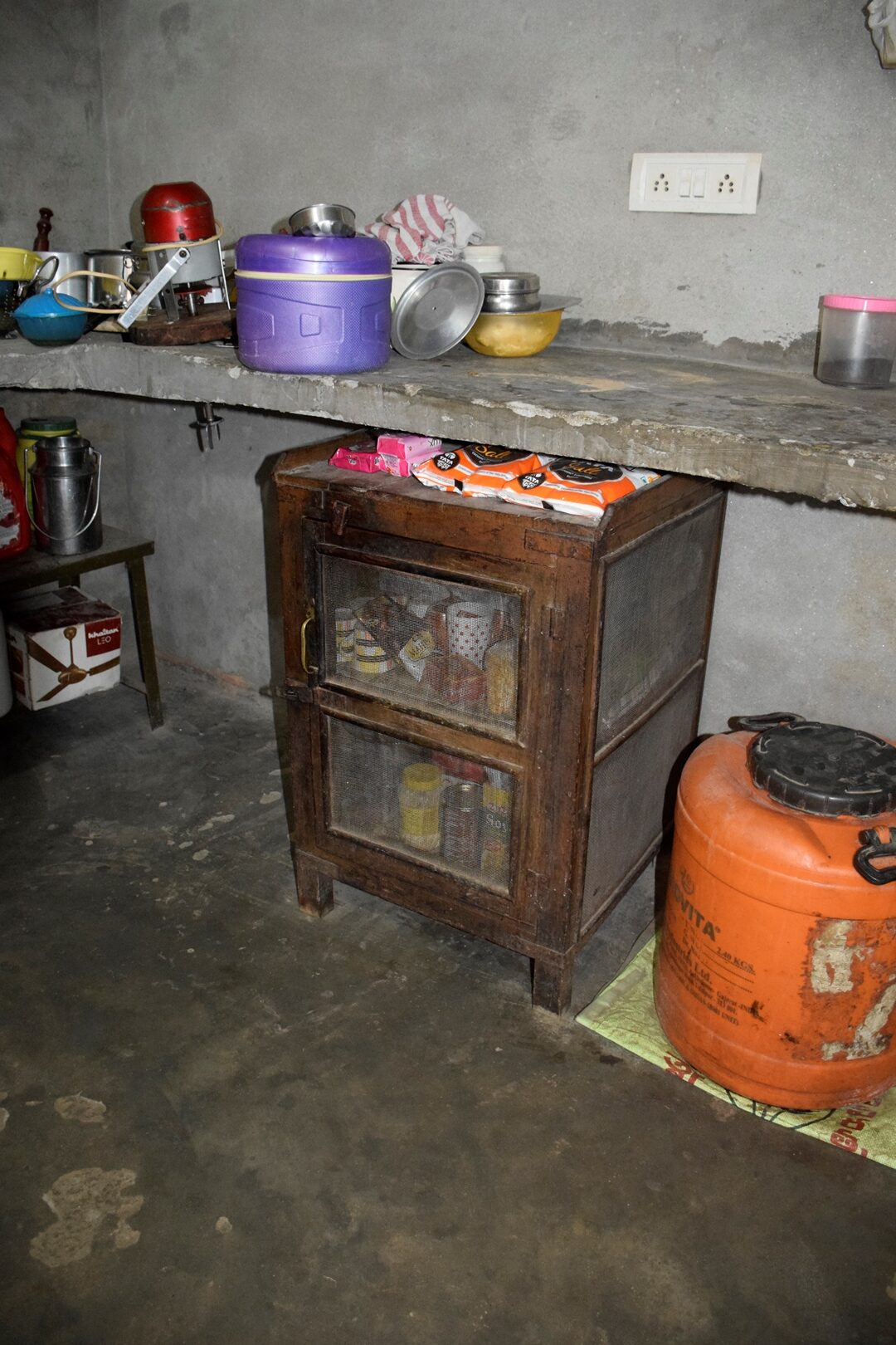 This small jaali was used to store spices, sugar, and containers of oil and ghee. It was kept below the kitchen counter to access these ingredients easily while cooking.