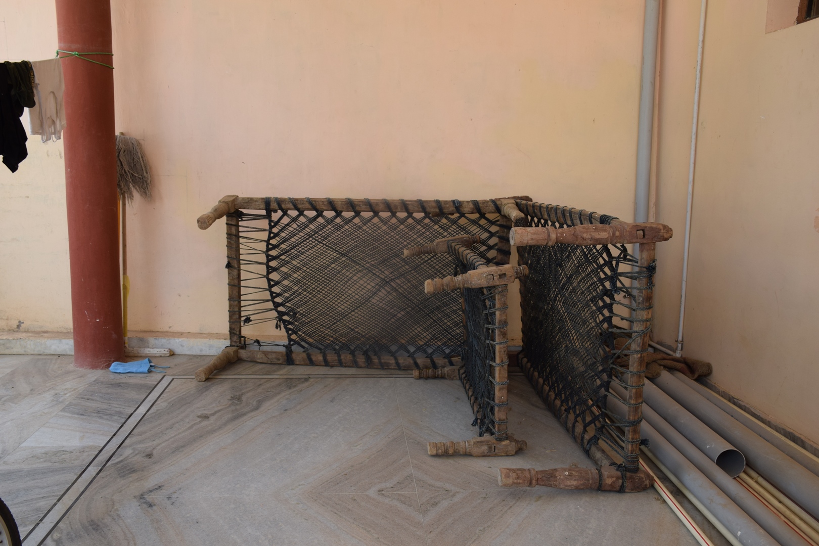 When not in use, khaat are placed upright resting on the frame. This is done to make space to carry out other activities. In a house in Udaipura village, a pair of khaat and a khatli (charpoy of a smaller size) were placed on their sides in the porch, where the family slept during hot summer nights.