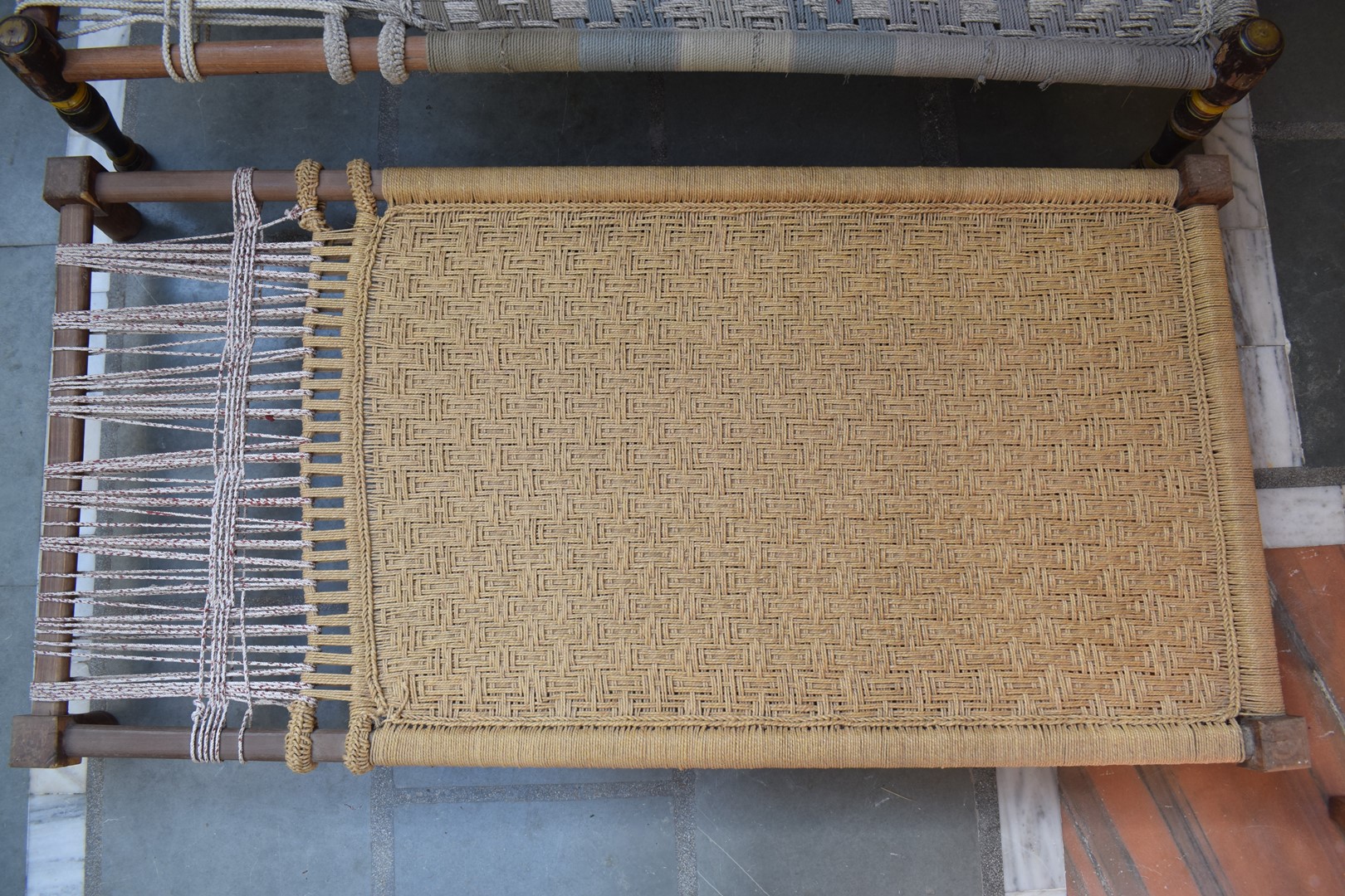 While the size of this khatli is like that of any other charpoy, it is differentiated because of its low height. This belonged to a collection where the owner had the khatli made recently.