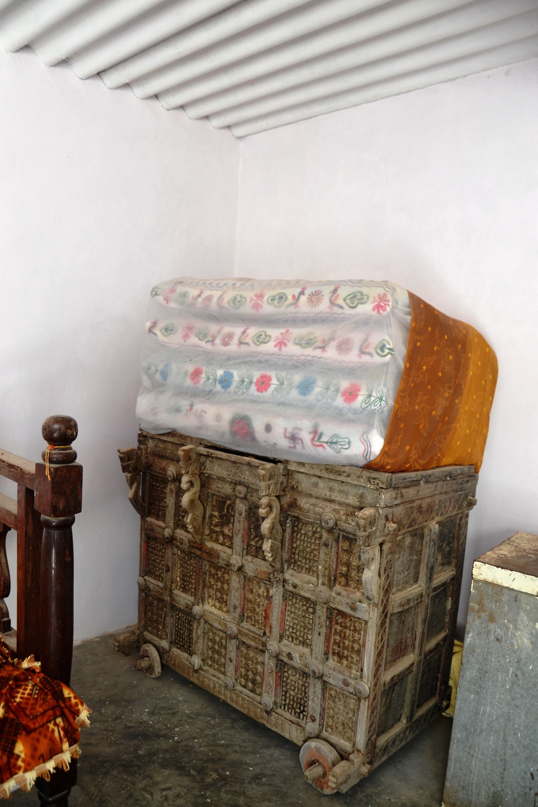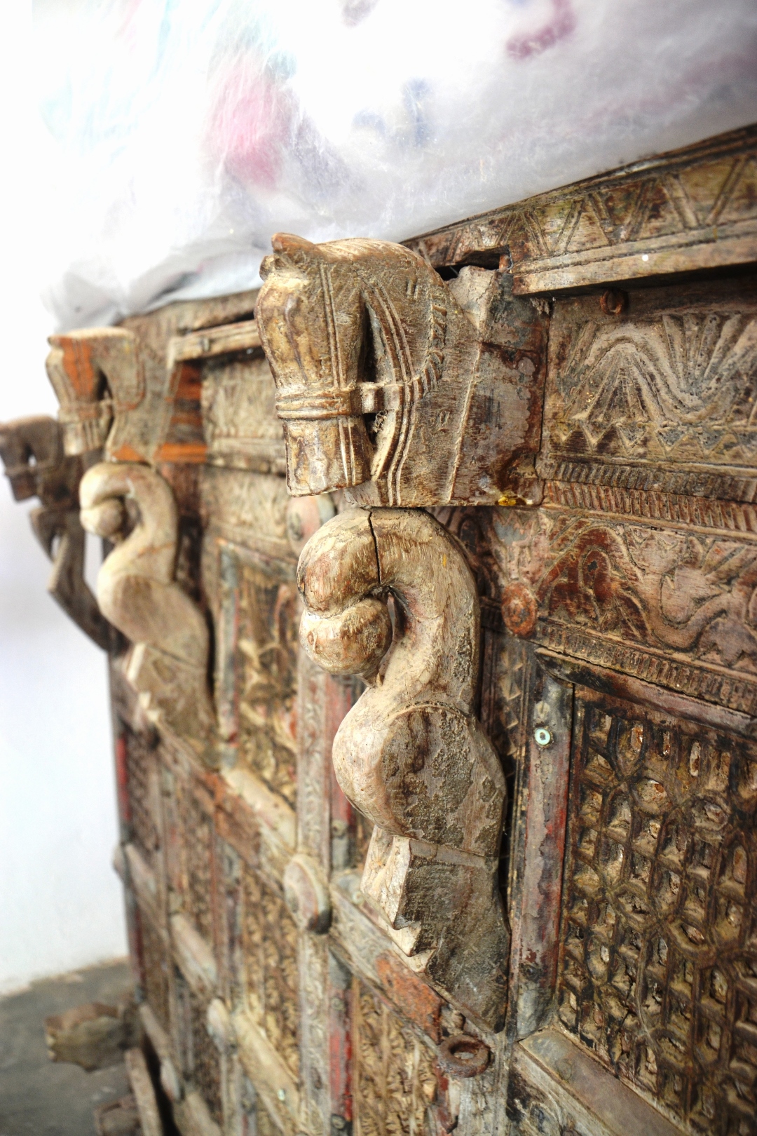 This majju has an eighteen panel grid on its façade. A closer look at the majju reveals the carved details of the horse heads, parrots and other motifs on the furniture.