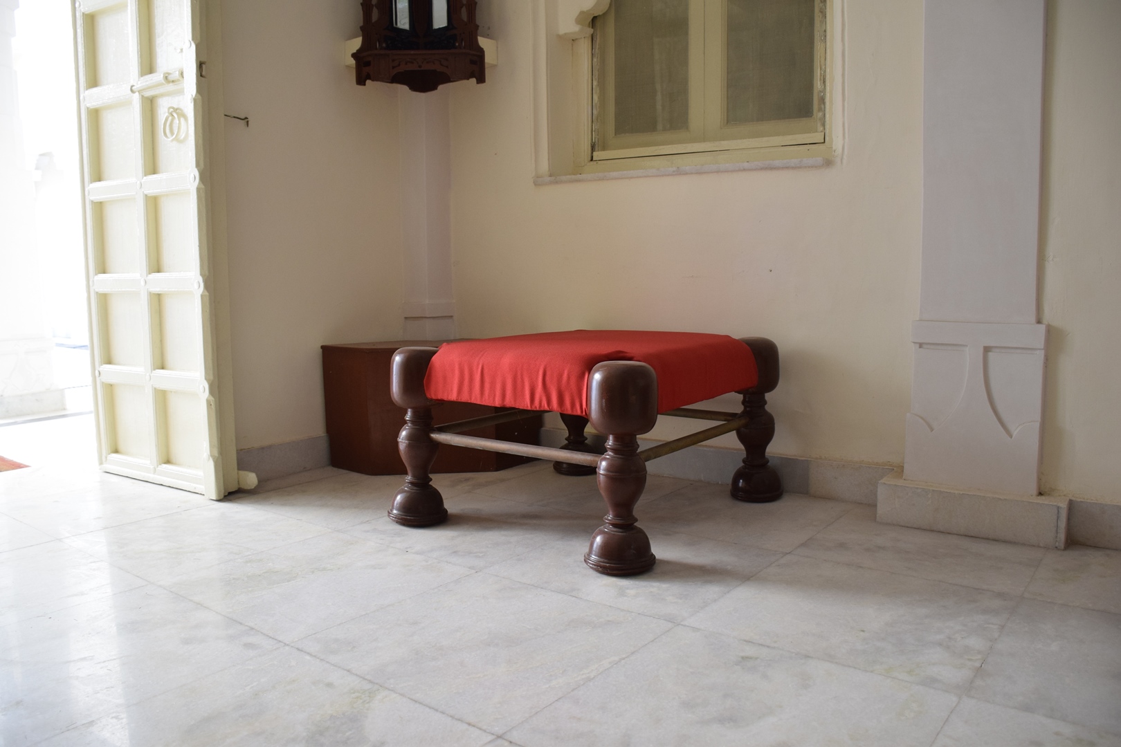 This pidha, along with three more similar ones are placed in the lobby area leading to an office space in the City Palace. The legs of these pidhi are made from turned wood and are finished with lacquer polish. Brass pipes are used as horizontal bracing members between the legs, along all four sides.