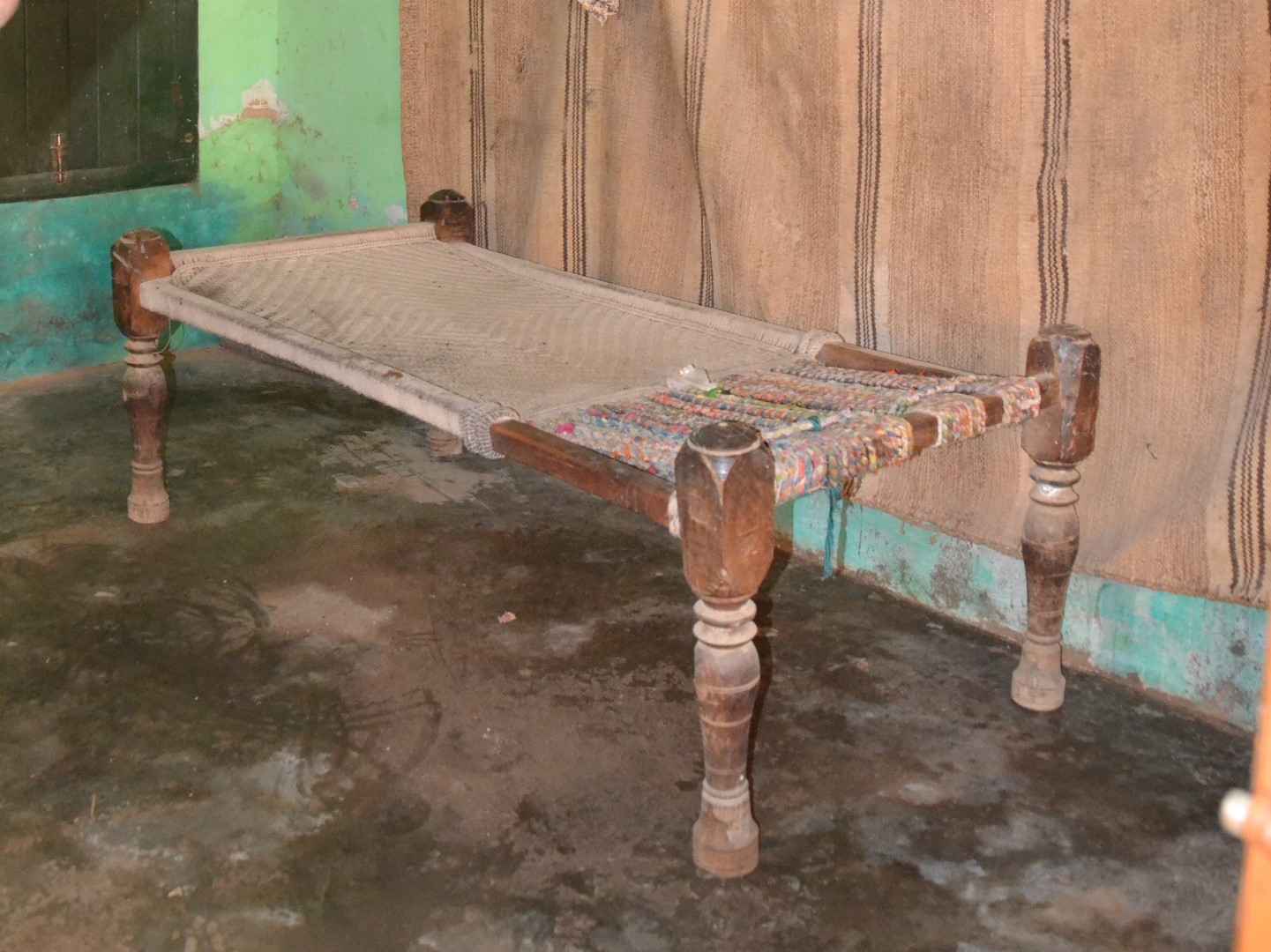 Depending on the variation in the dialects of the local language, charpoy are also called as pilang in a few regions of Haryana. This pilang was recorded in the baithak of a house and was used by the men from the neighbourhood to rest and socialise. A rug made from camel hair was hung on the wall, behind the pilang.