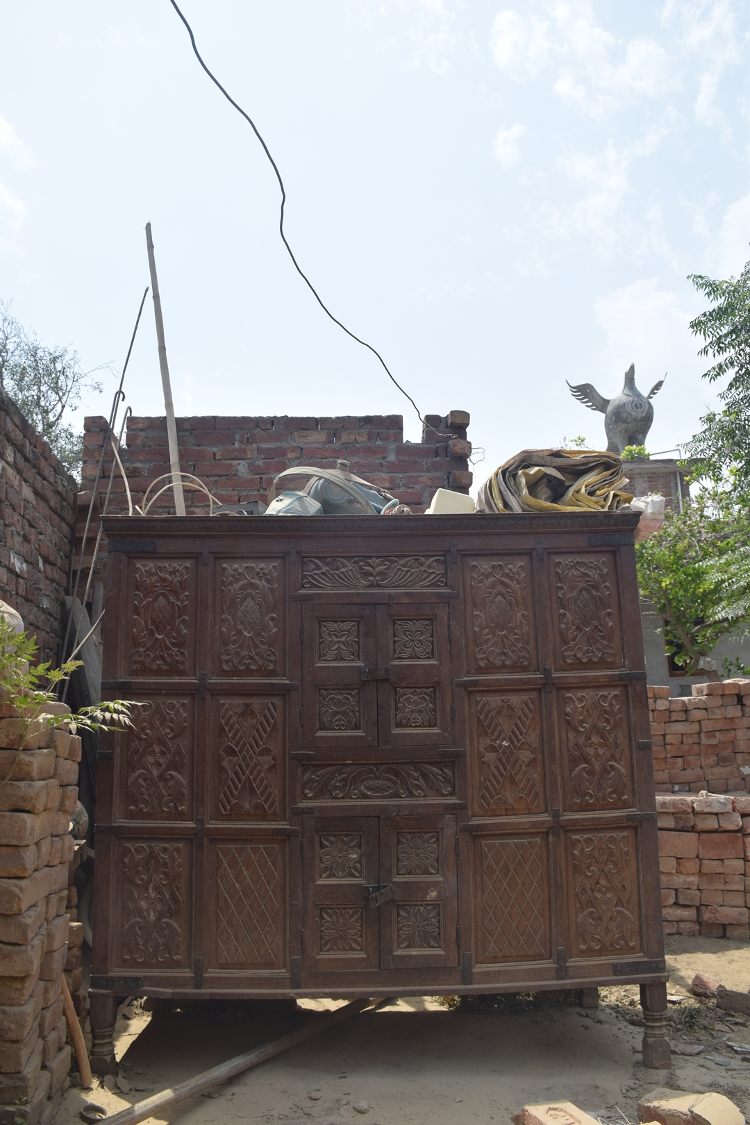 This intricately carved sandook was placed in the courtyard of a house under renovation. It was divided horizontally into two compartments and the opening of each was provided with double doors. It was owned by the lady of the house whose father had commissioned it for her wedding around eighty years ago.