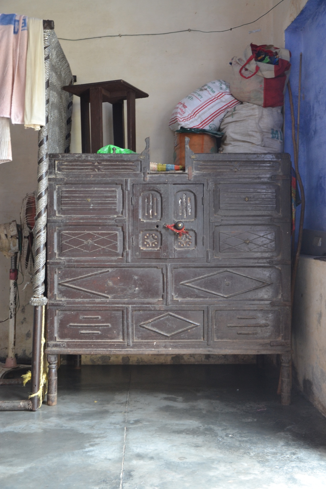 While giving the sandook as a gift to the bride in her wedding, a red coloured thread is tied around the knob or either of the legs as a part of the traditional ritual. This sandook, placed in the corner of the room had the thread tied on the knob of the opening. It was replaced during festivals or on auspicious occasions in the house.